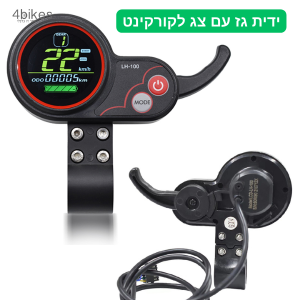 ידית גז עם צג לקורקינט או לאופניים חשמלייםמתאים לבקר שתומך בצג דיגיטלי ( 5 פינים) וידית גז מובנה ( פין 1 ).צג דגם LH-100 פופולארי בקורקינטים רבים שרוצים לחסוך מקום בכידון.עיצוב הידית גז בעלת רגישות גובה לתגובה מהירה.מאפשר שליטה על: הילוכי המנוע, תאורה.מציג: מד סוללה, קילומטר, מהירות, הילוכים, תאורה.יציאת USB לטעינה 5V-2A.מתאים למתח 24V-36V-48V-60V.מתאים לכל הבקרים שיש אצלנו.